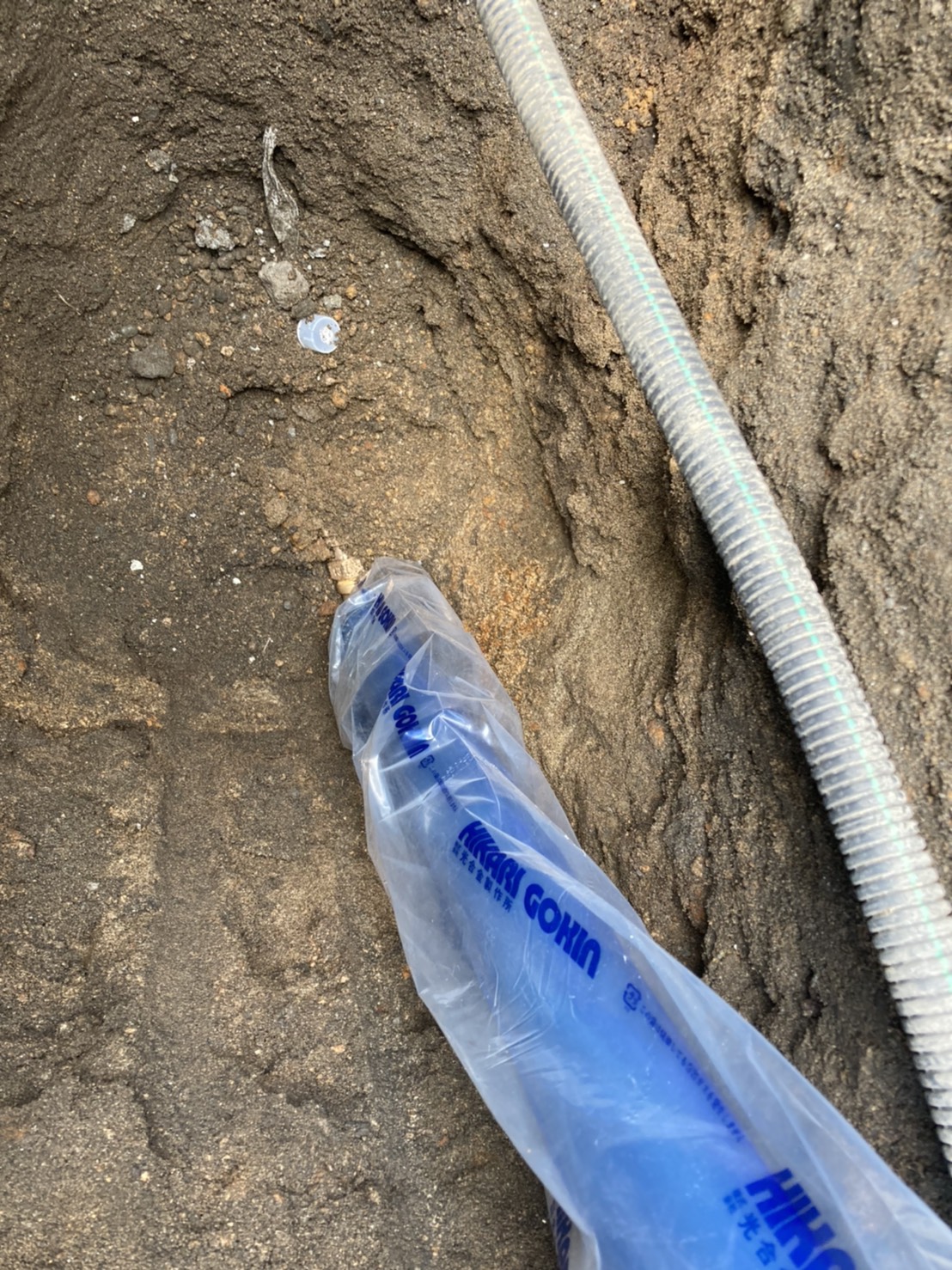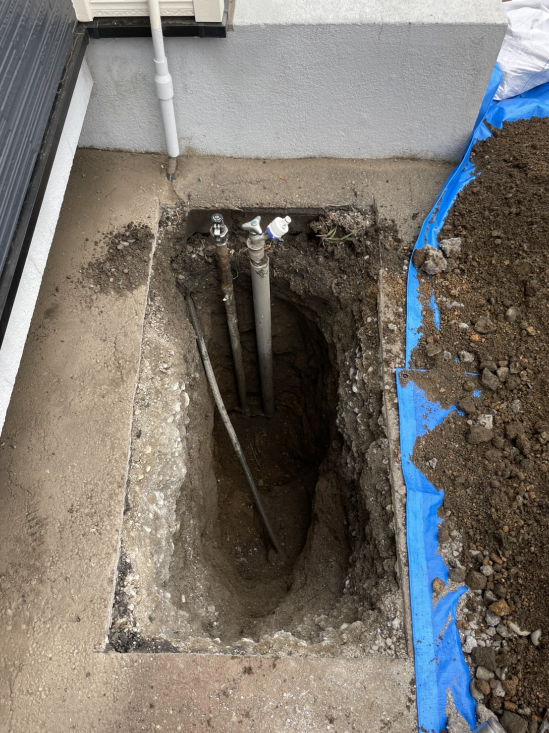 水道管との接続部が見える所まで穴を掘り本体交換を行いました。