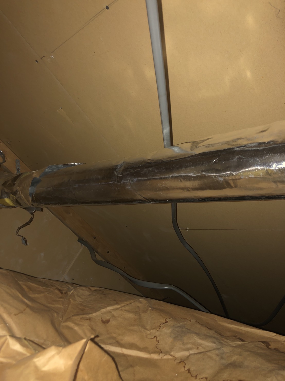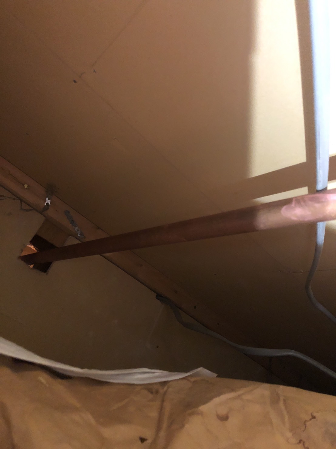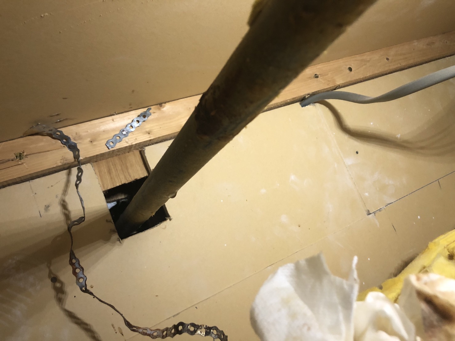 配管が鉄管で伸びている為、中途半端な場所で取替えが出来ない為トイレの天井を開口し、一部分ごっそり引き直しました。