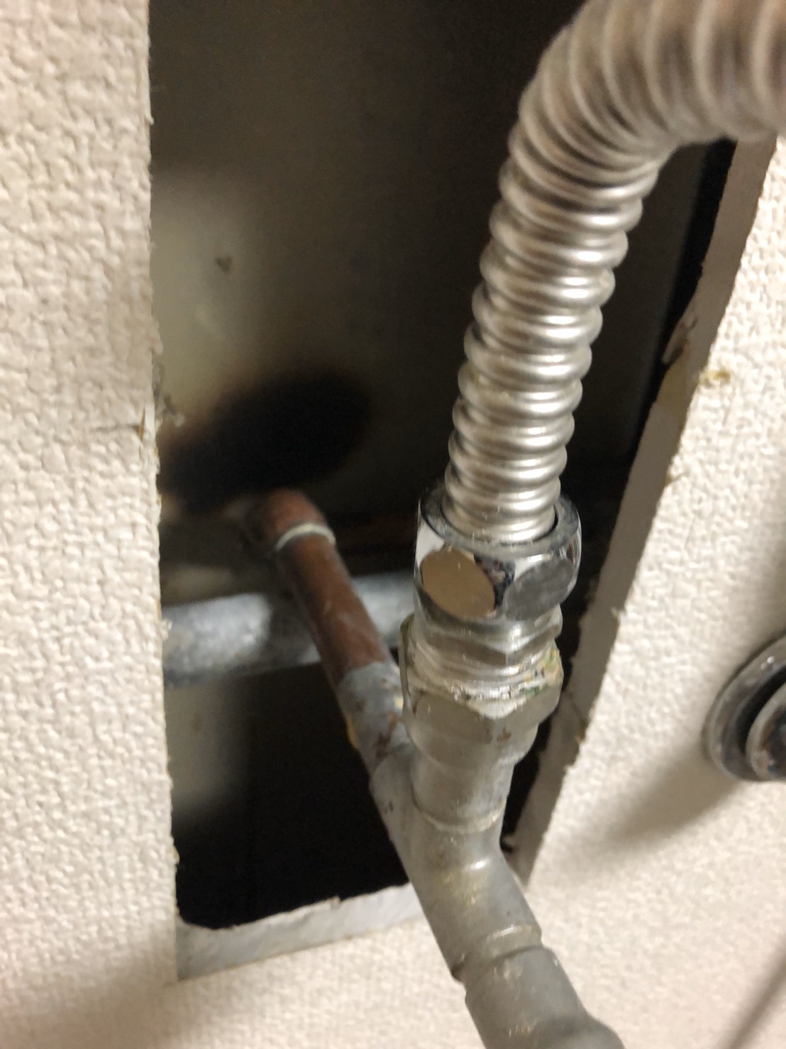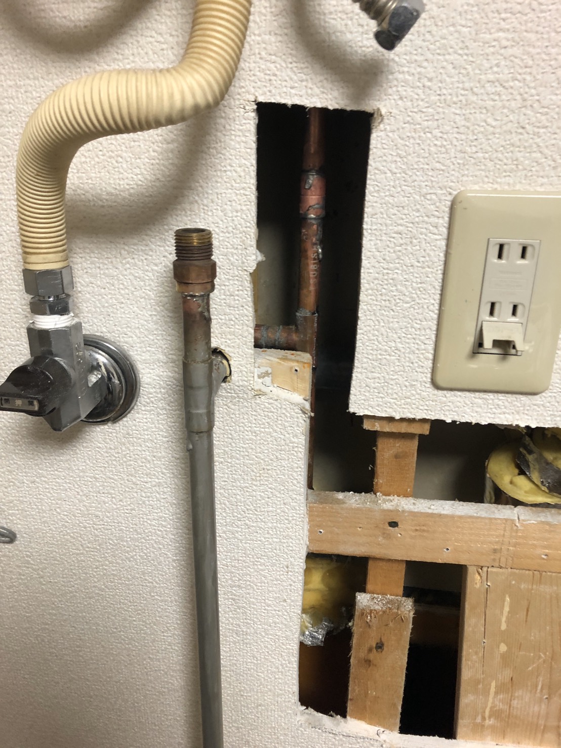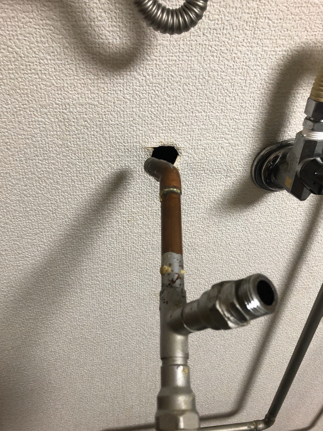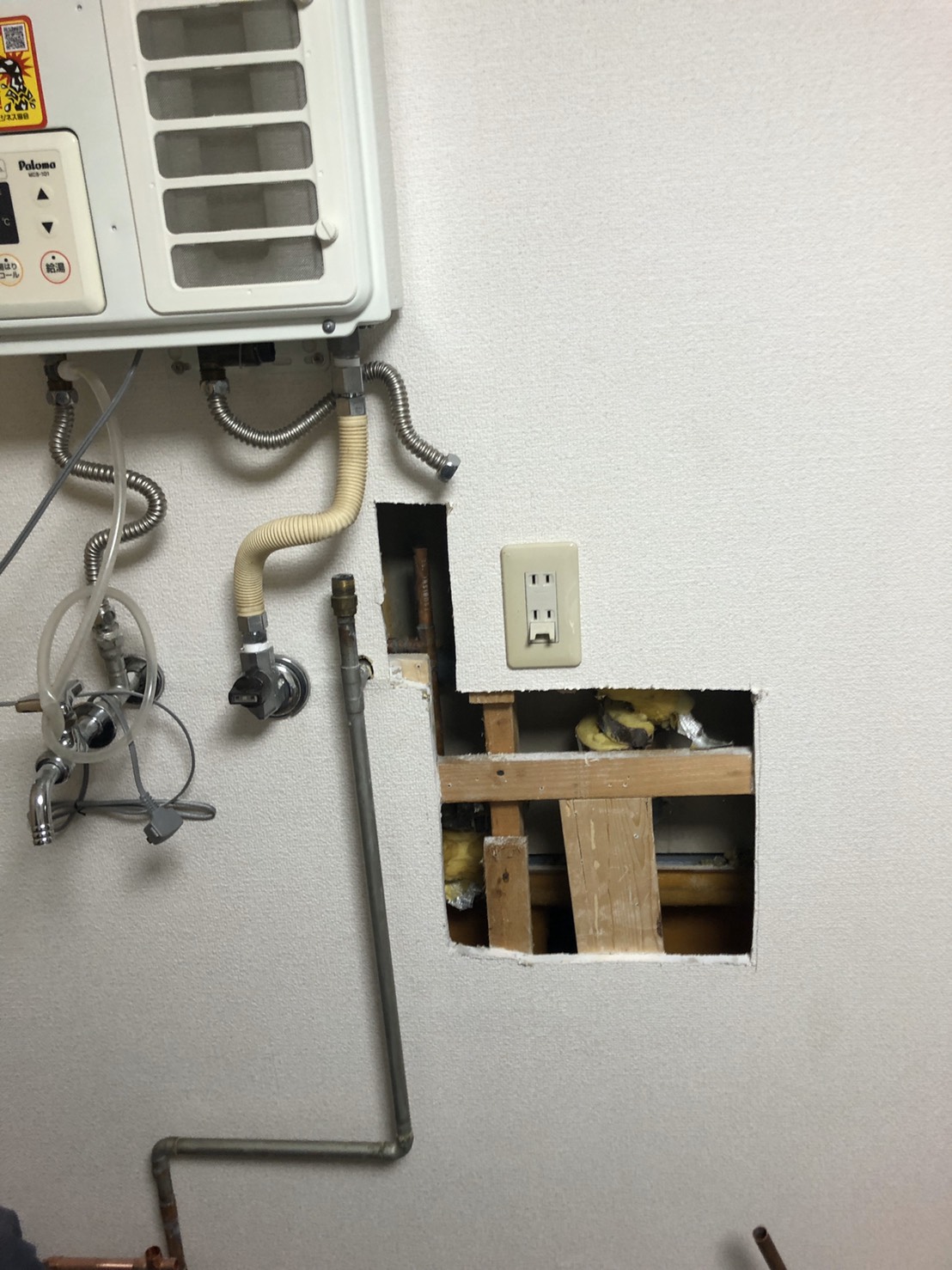 壁を開口し、破裂している水道管を修理し症状が改善しました。