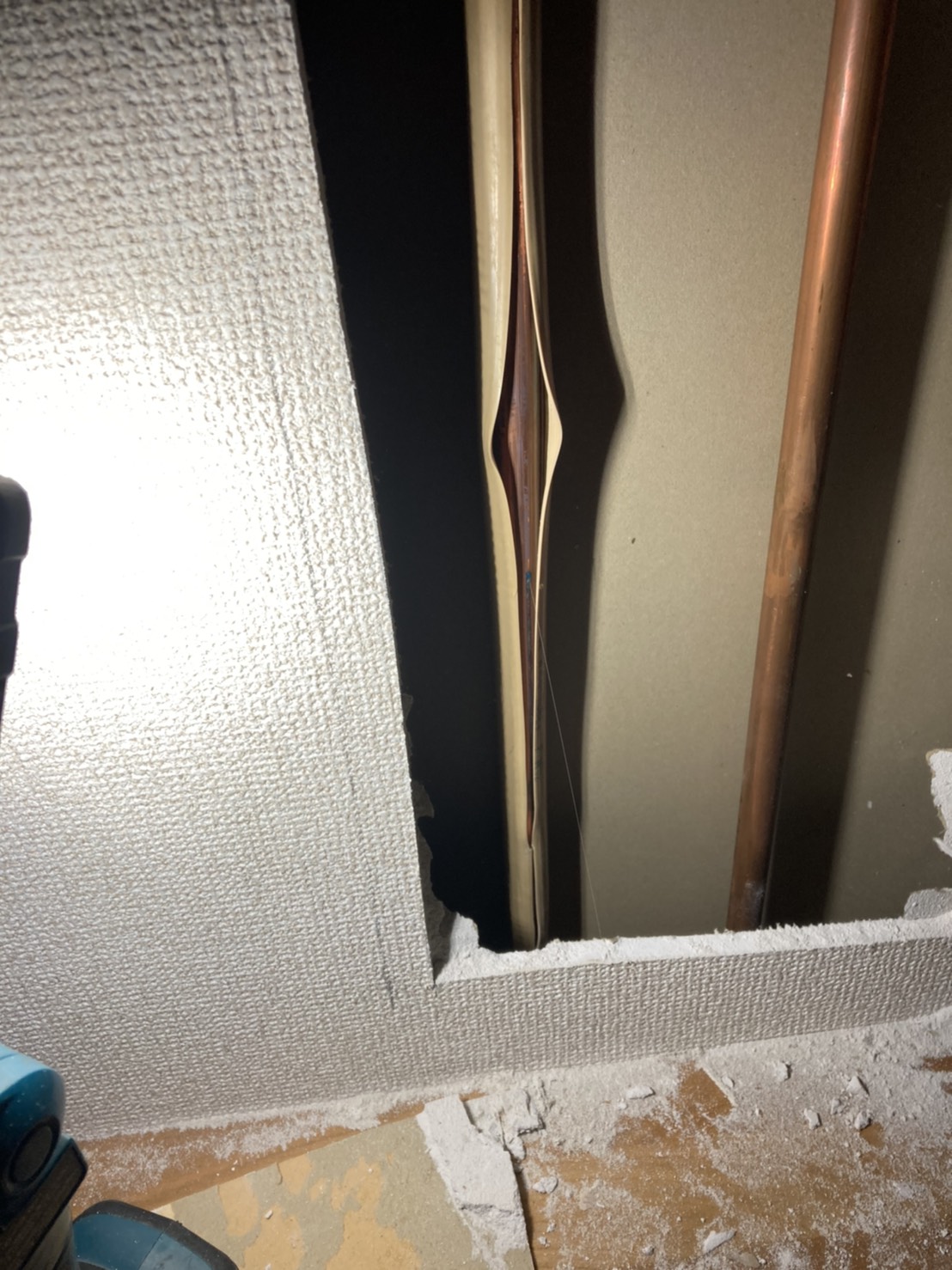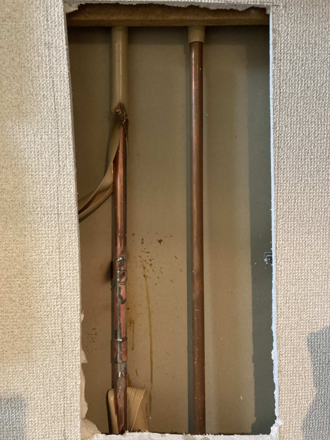 壁を開口し水道管を調べた所、水道管にピンホールがあった為、水道管を切断し新に作り直し症状が改善しました。