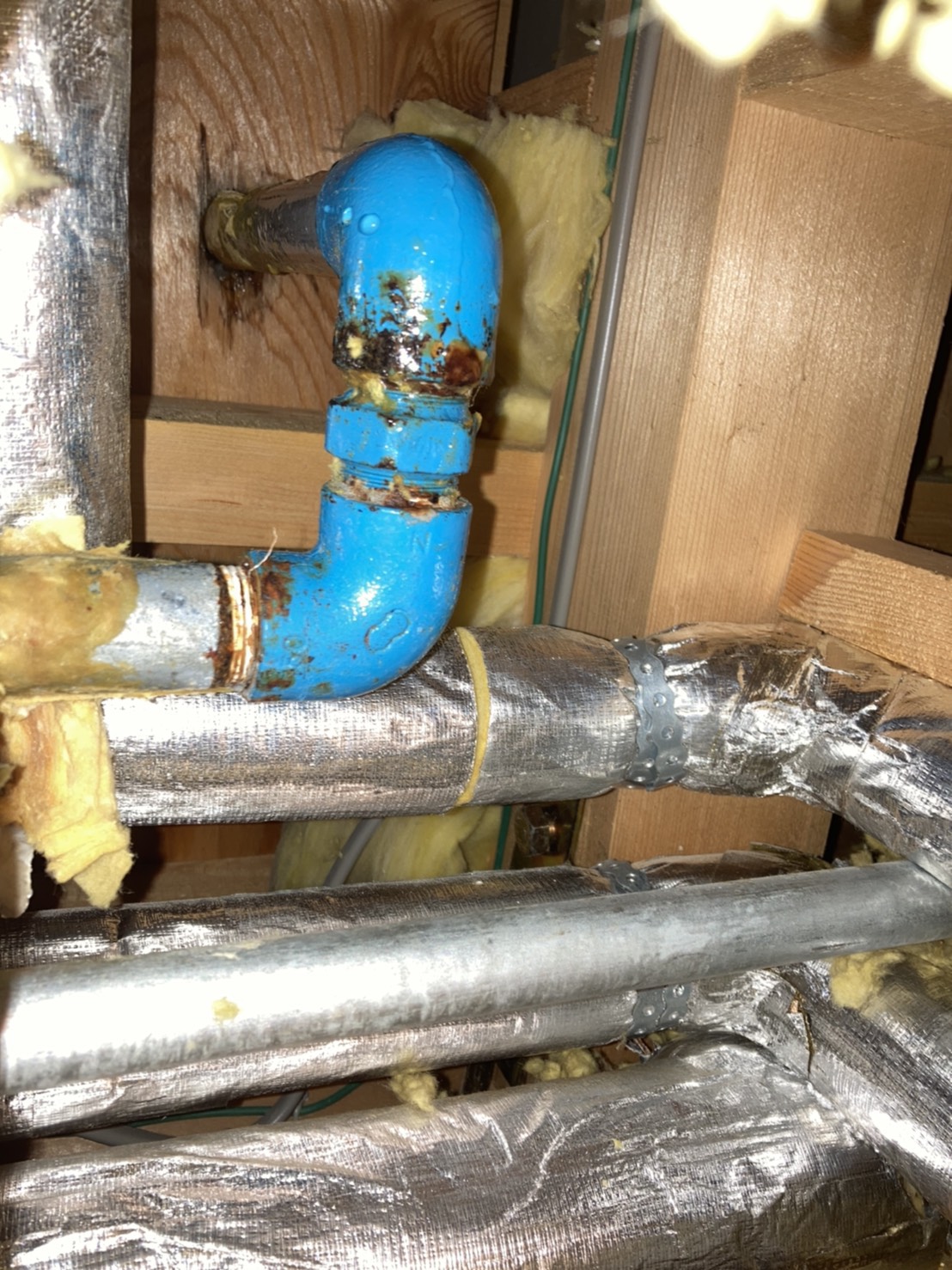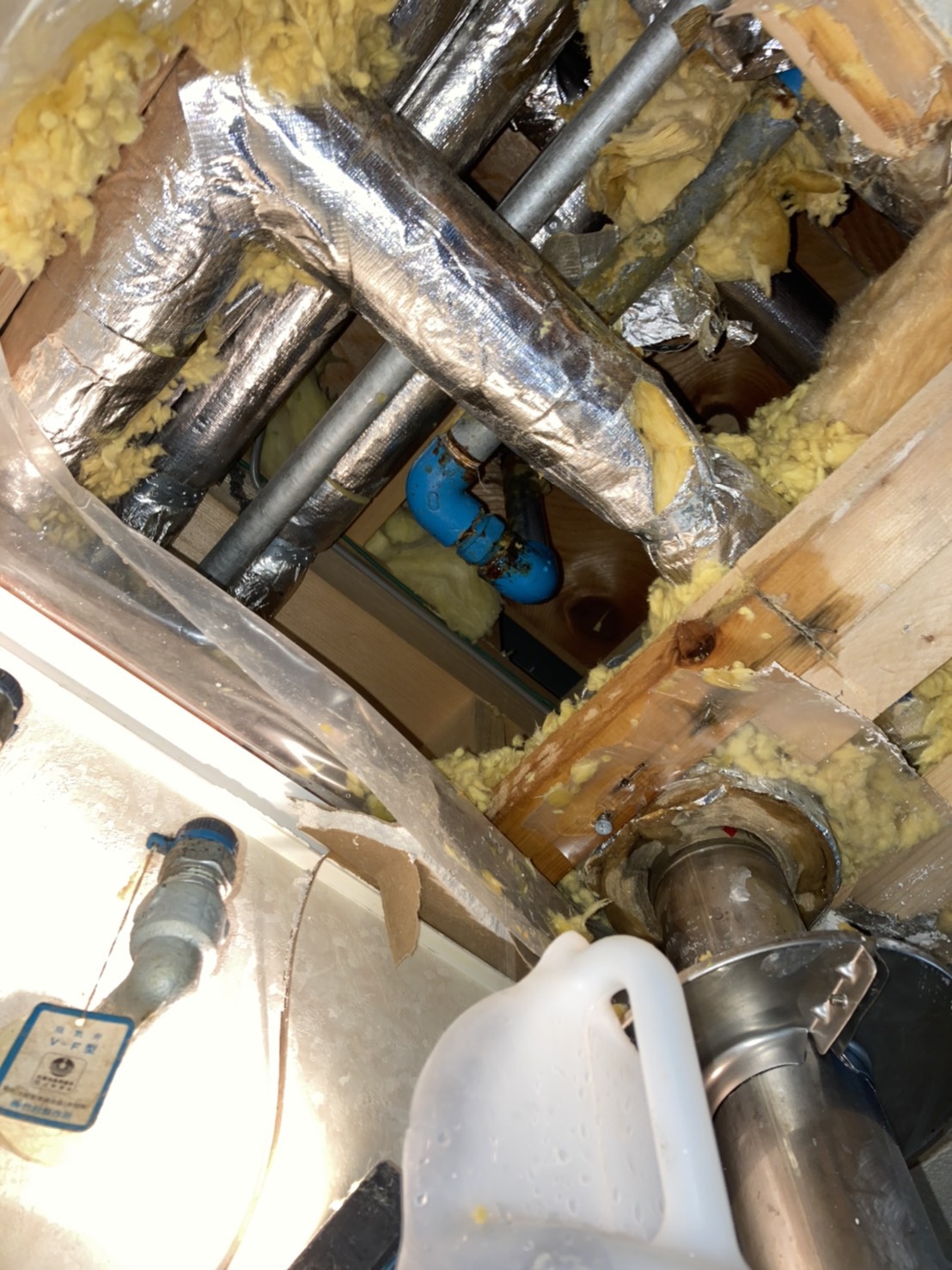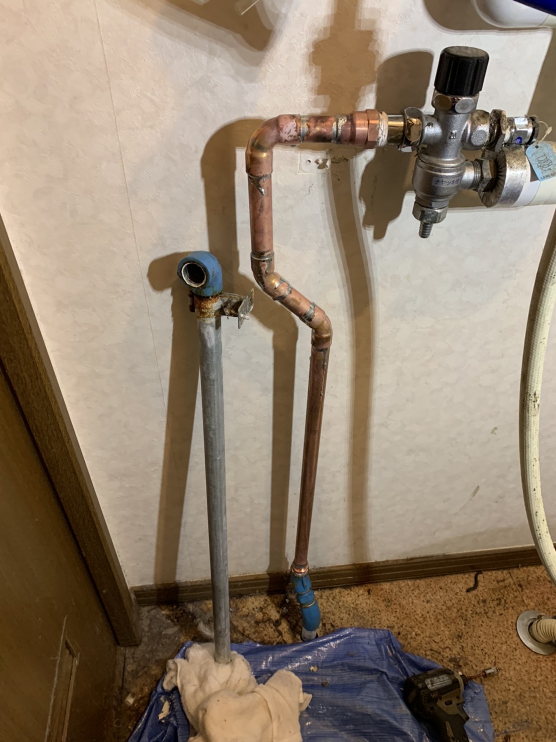 脱衣所の天井裏に上り水道管を調べた所、水道管に穴が開いていた為、修理の見積りを事前に提示しご納得いただき作業を行いました。