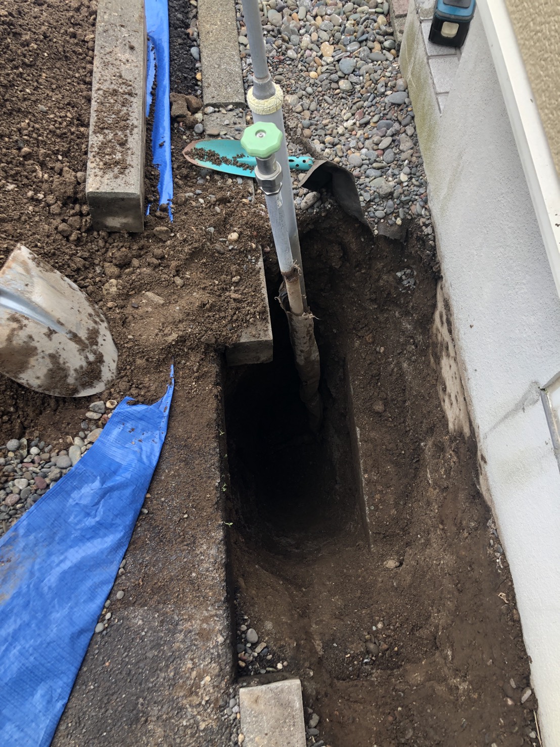 水道管との接続部が見える所まで穴を掘り本体交換を行いました。