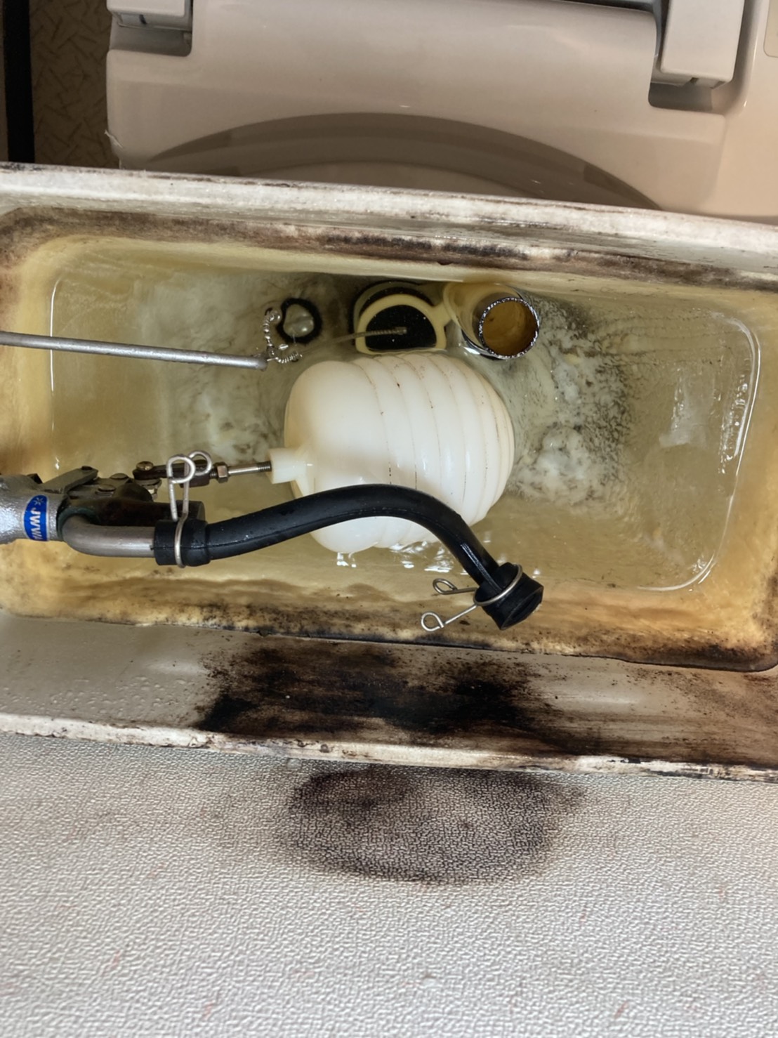 トイレのタンクを確認した所、フロート弁という部品が劣化してタンクの水が便器に流れ続けている状態でした。