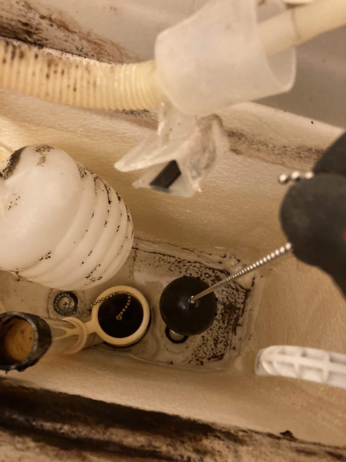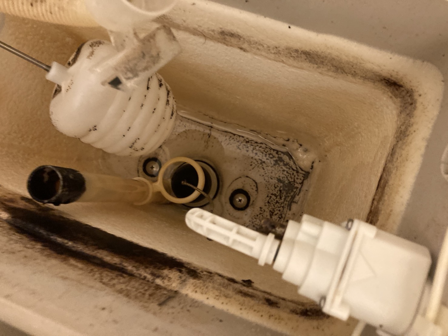 トイレのタンクを確認した所、フロート弁という部品が劣化してタンクの水が便器に流れ続けている状態でした。