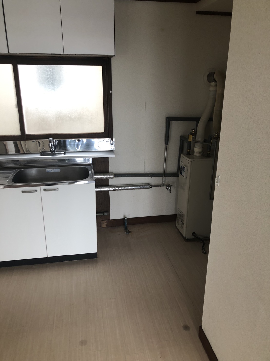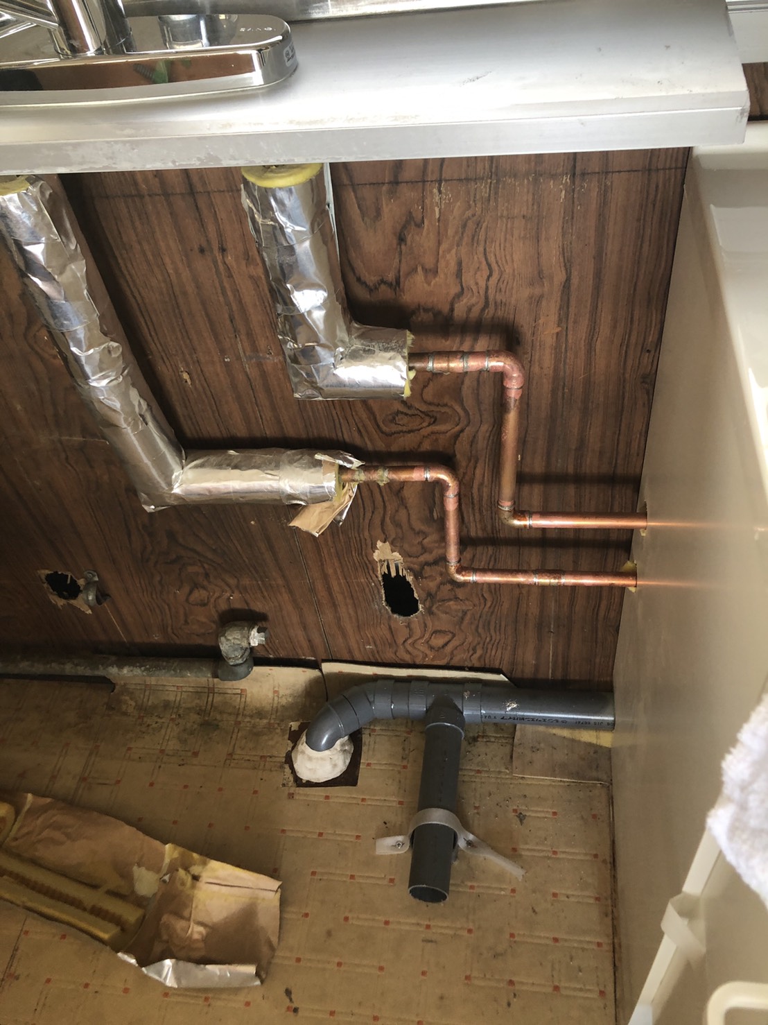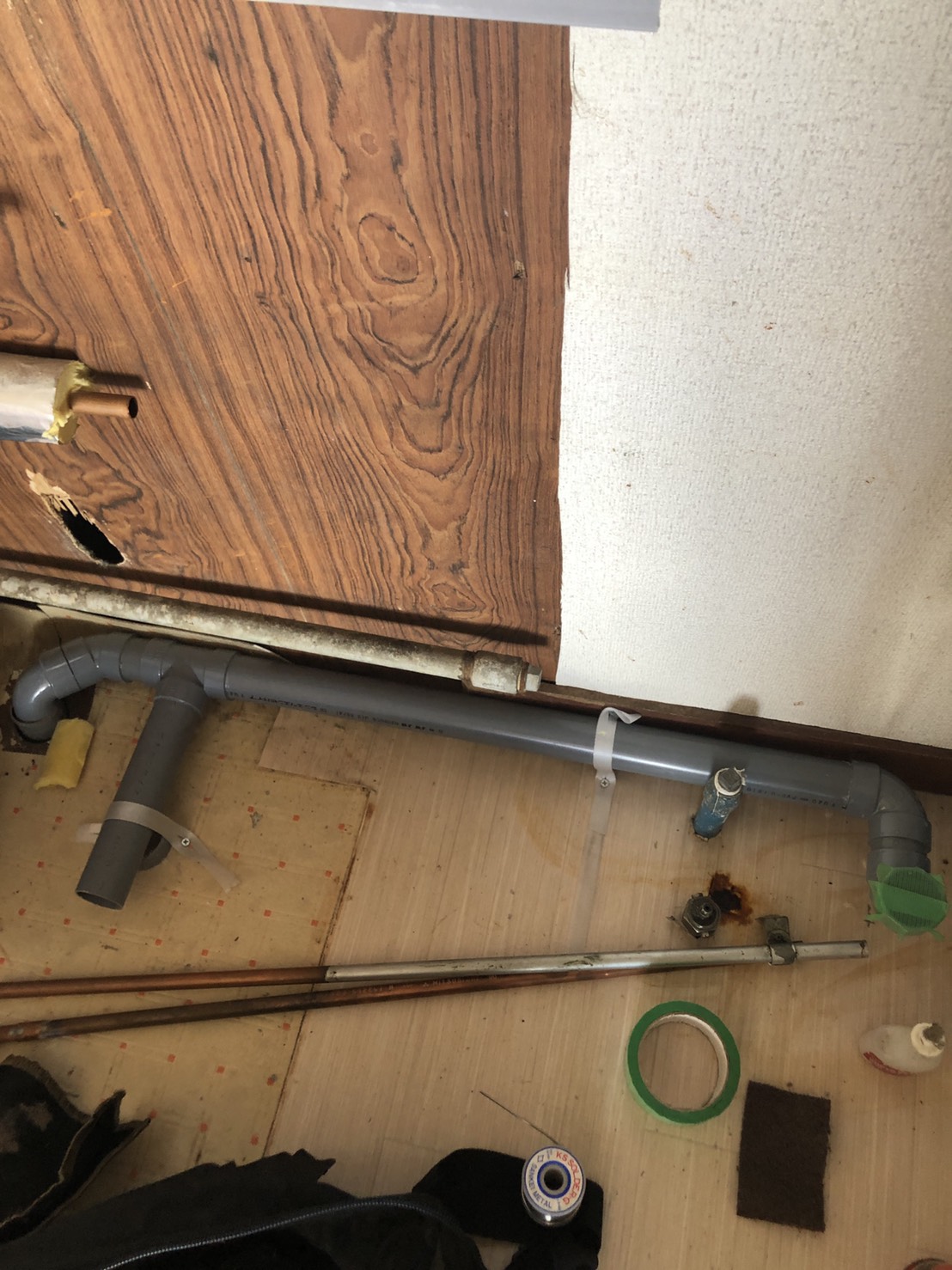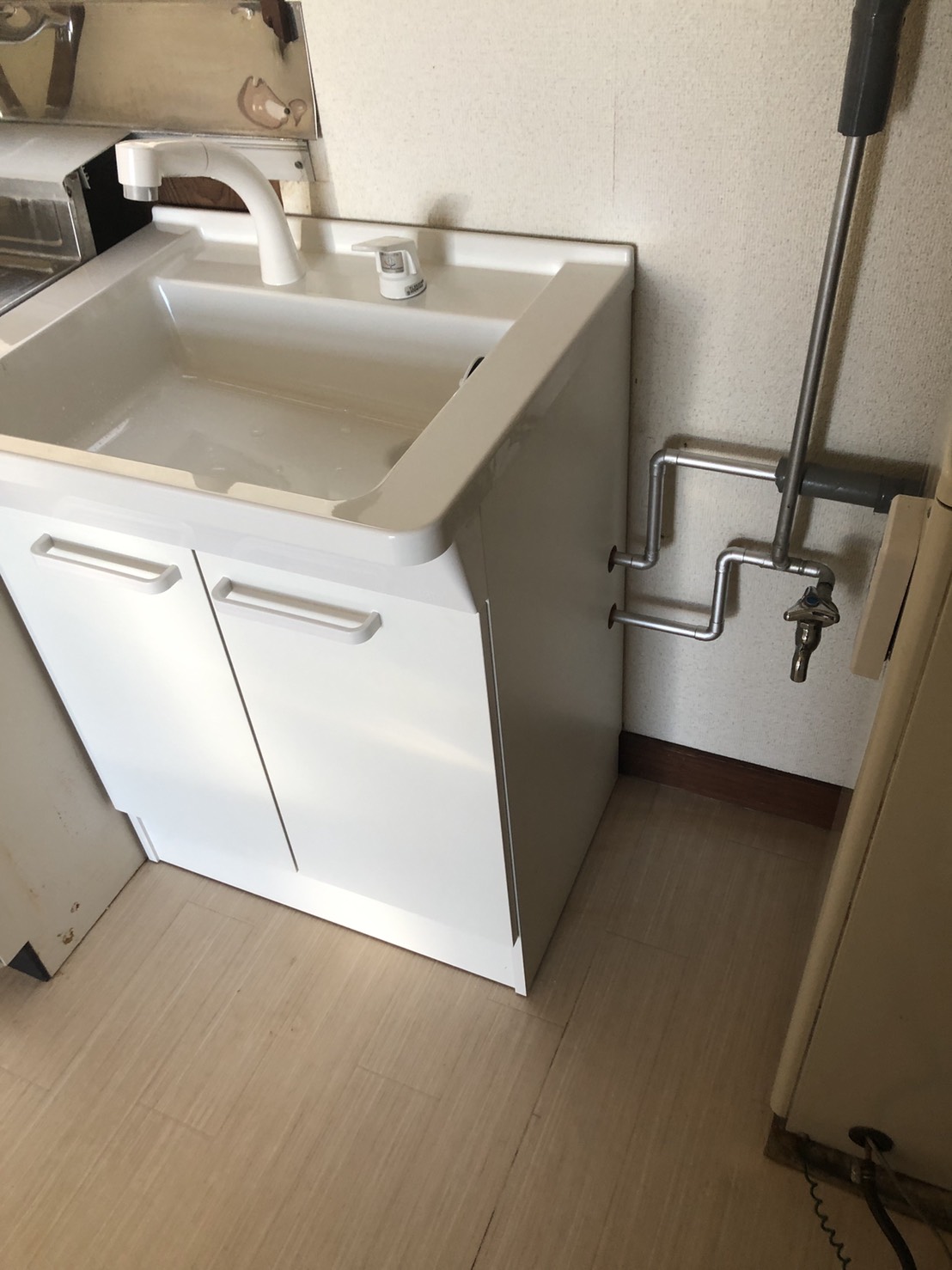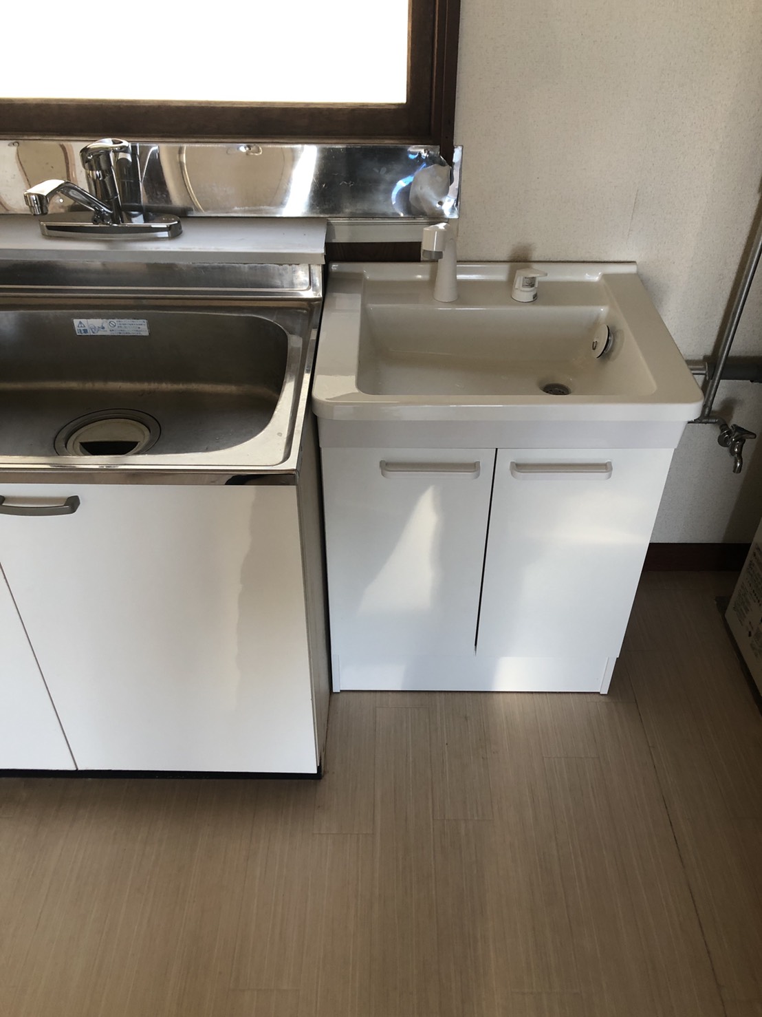 流し台を外し排水管を作成し、給水・給湯管を作成し洗面台の取付を行いました。