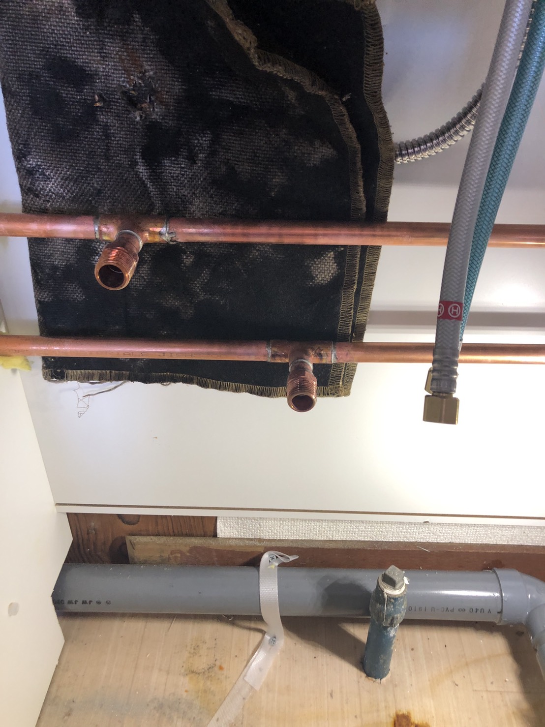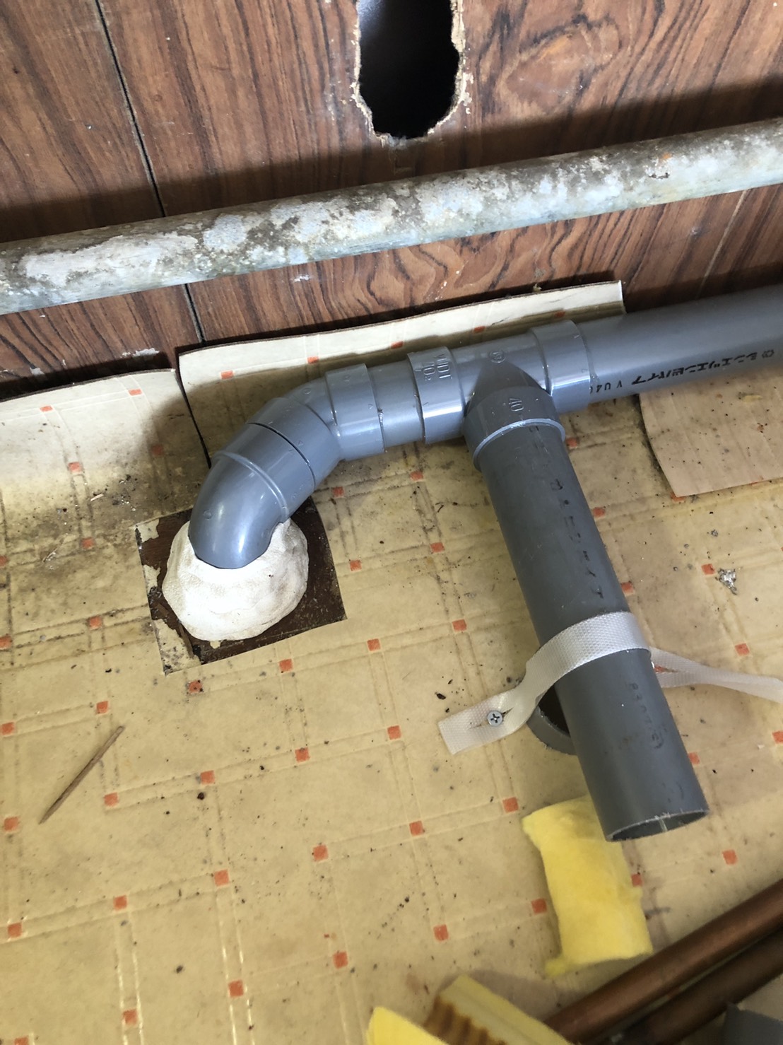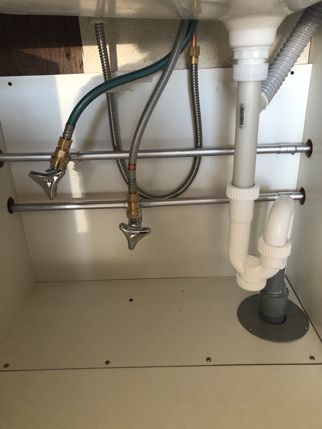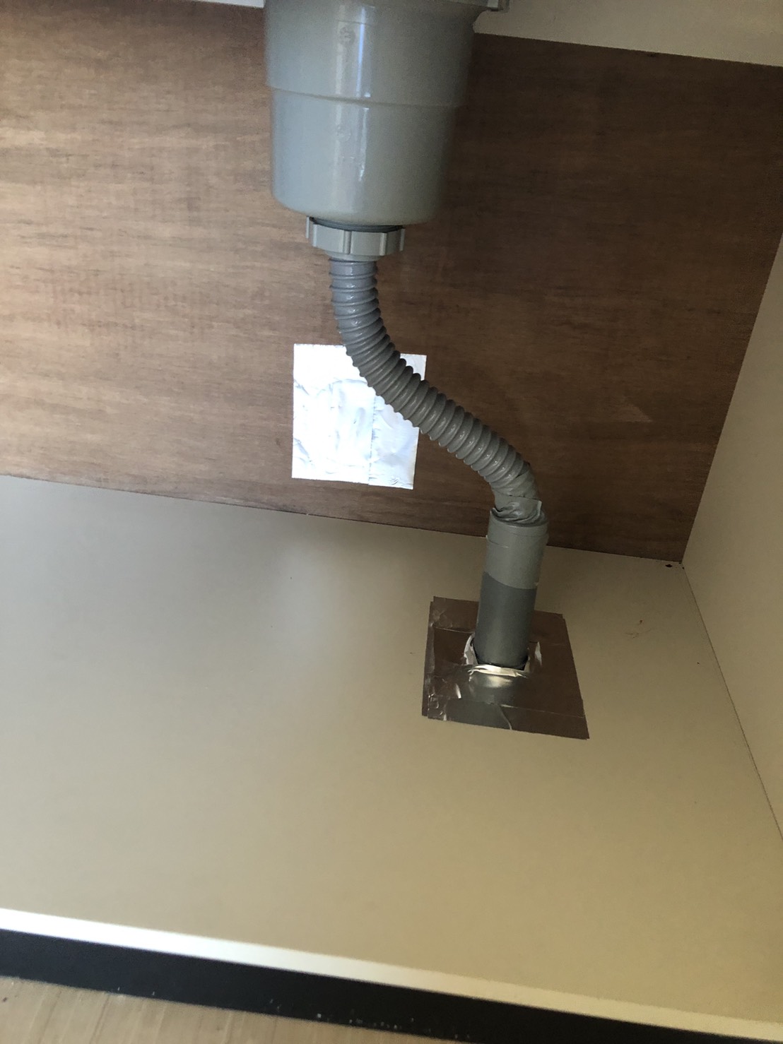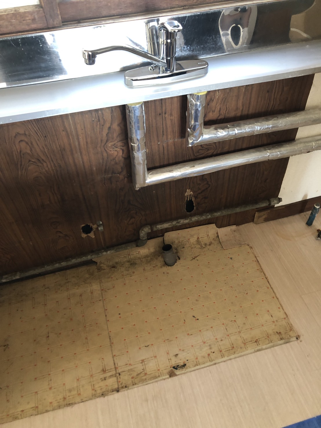流し台を外し排水管を作成し、給水・給湯管を作成し洗面台の取付を行いました。