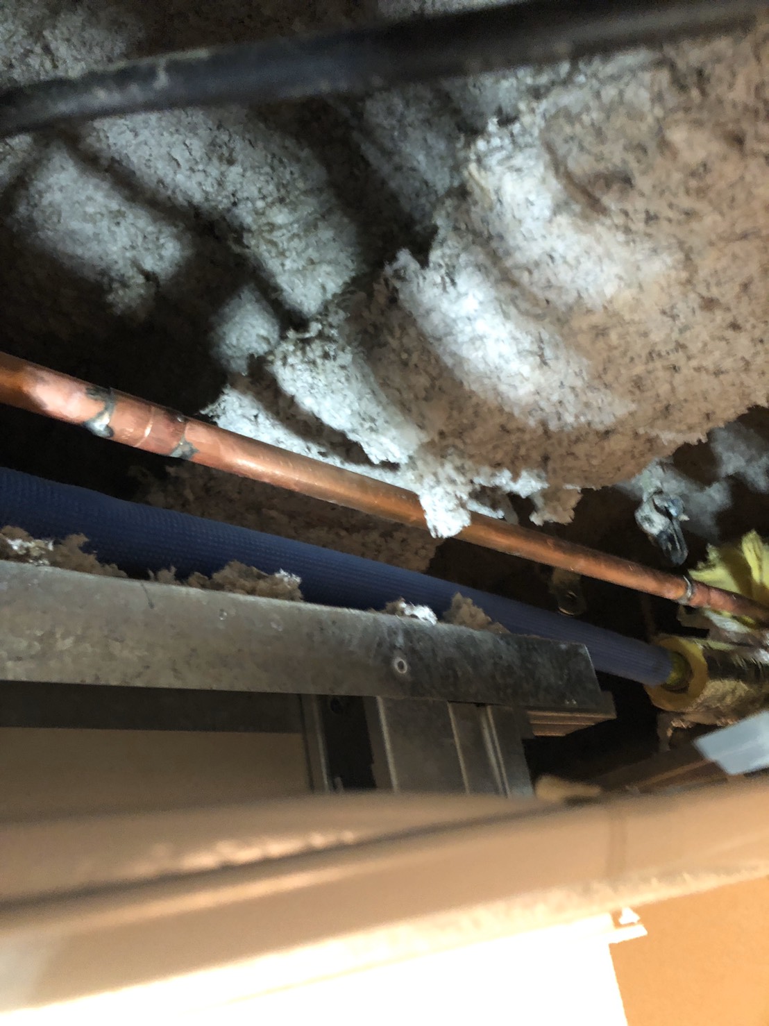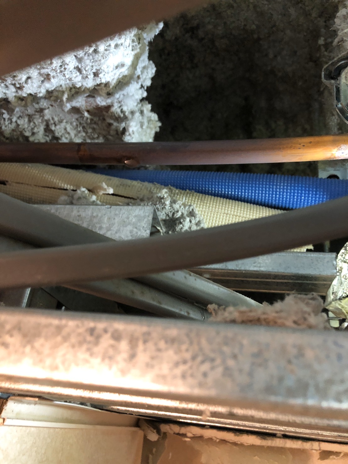 天井ボードを開口し、確認した所天井に通っている水道管が劣化し水漏れしていた為、水漏れしている水道管を切断し修理しました。