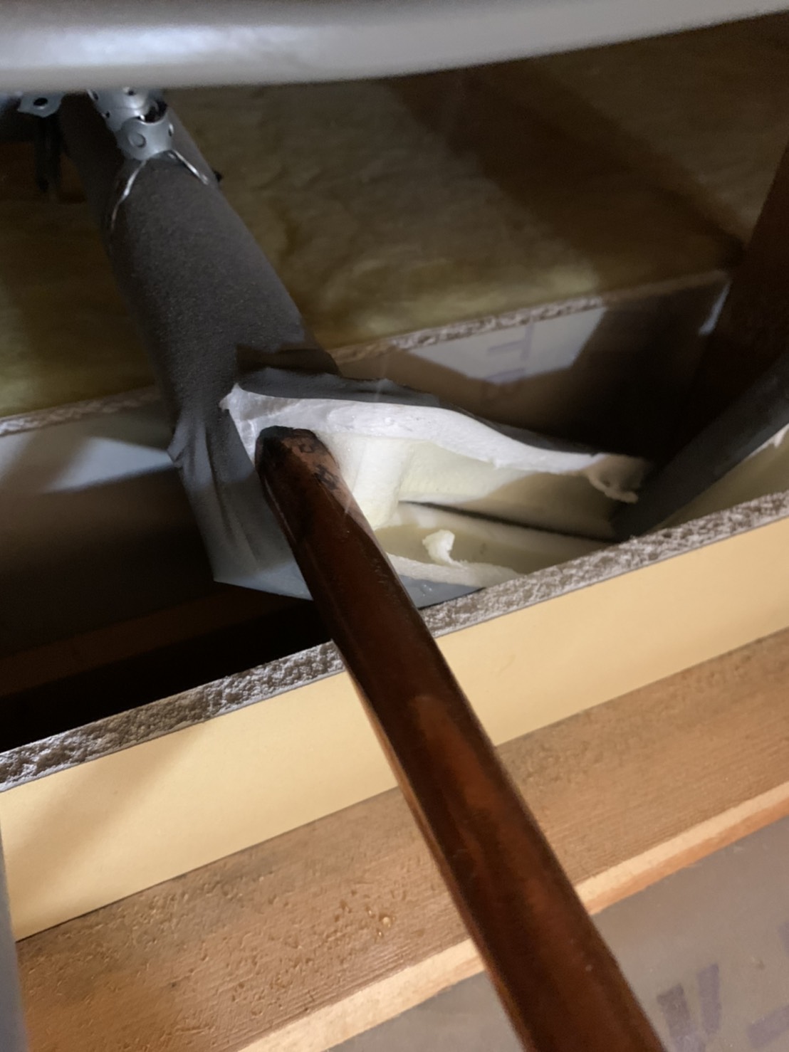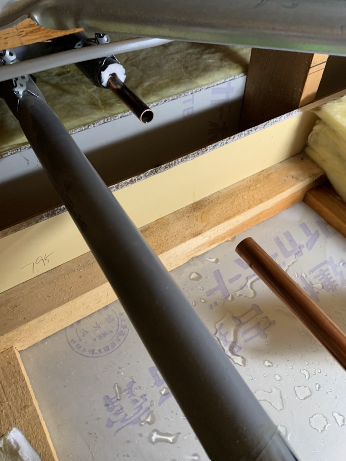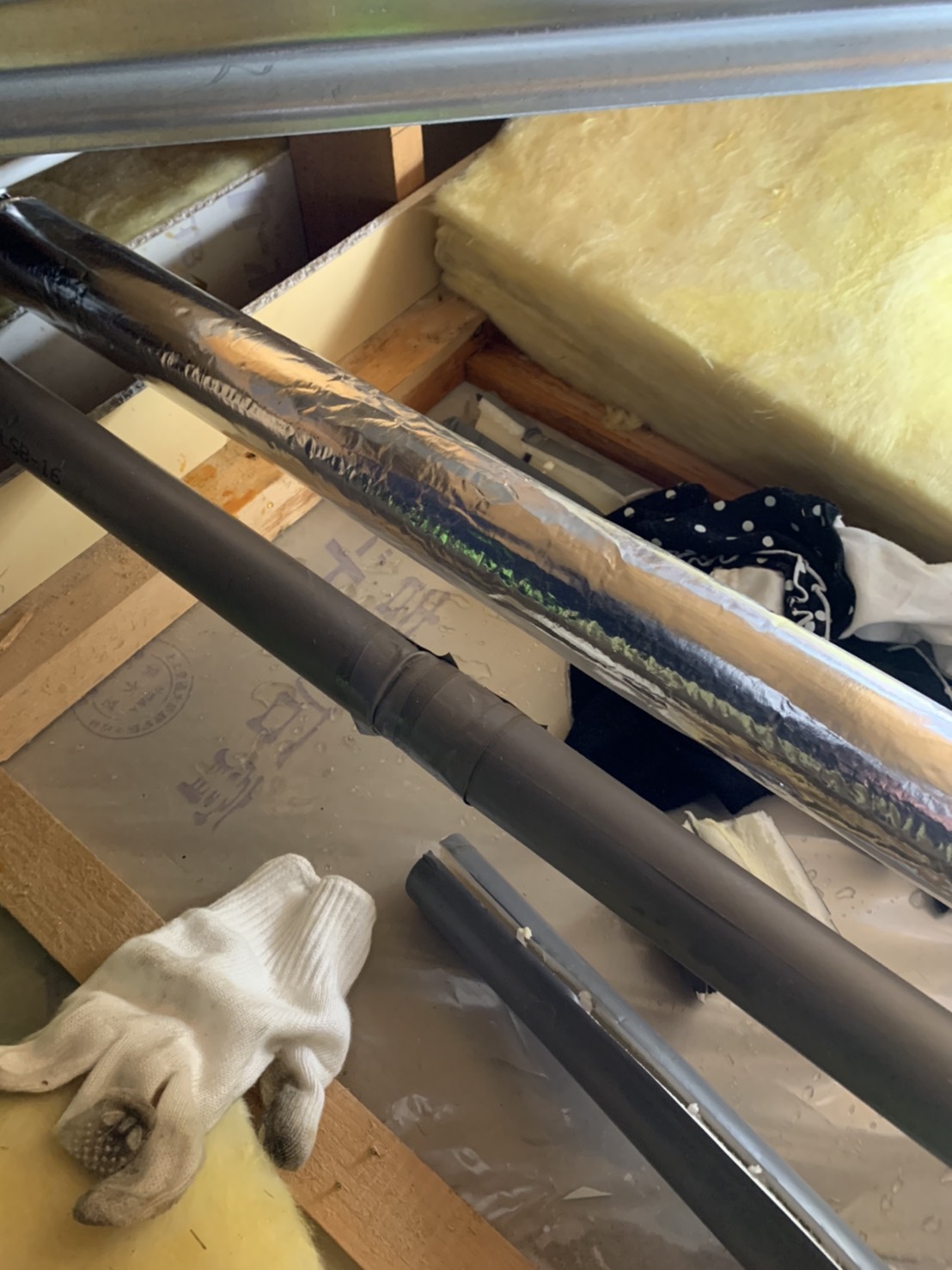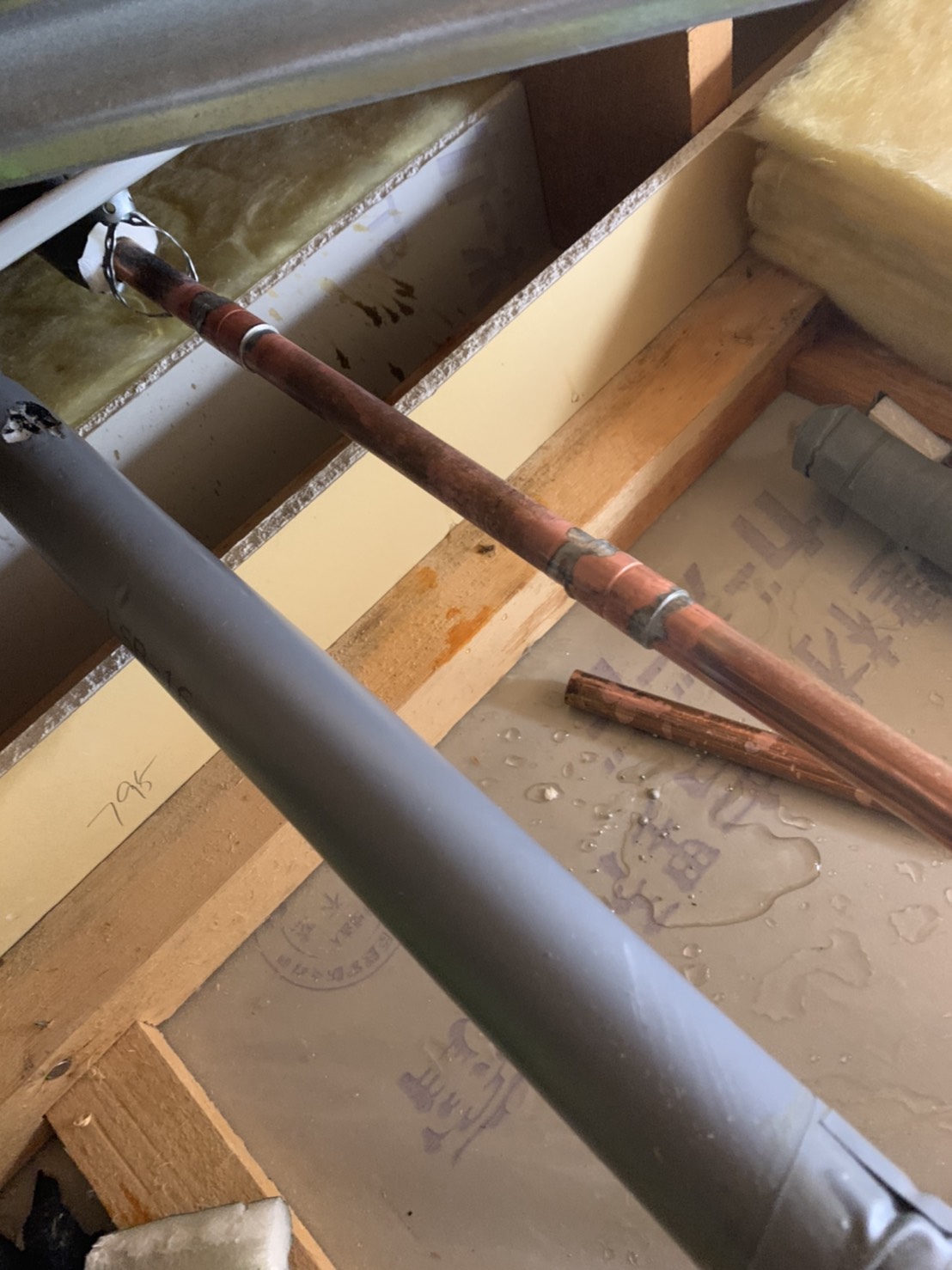脱衣所の天井裏に上り水道管を調べた所、水道管に穴が開いていた為、修理の見積りを事前に提示しご納得いただき作業を行いました。