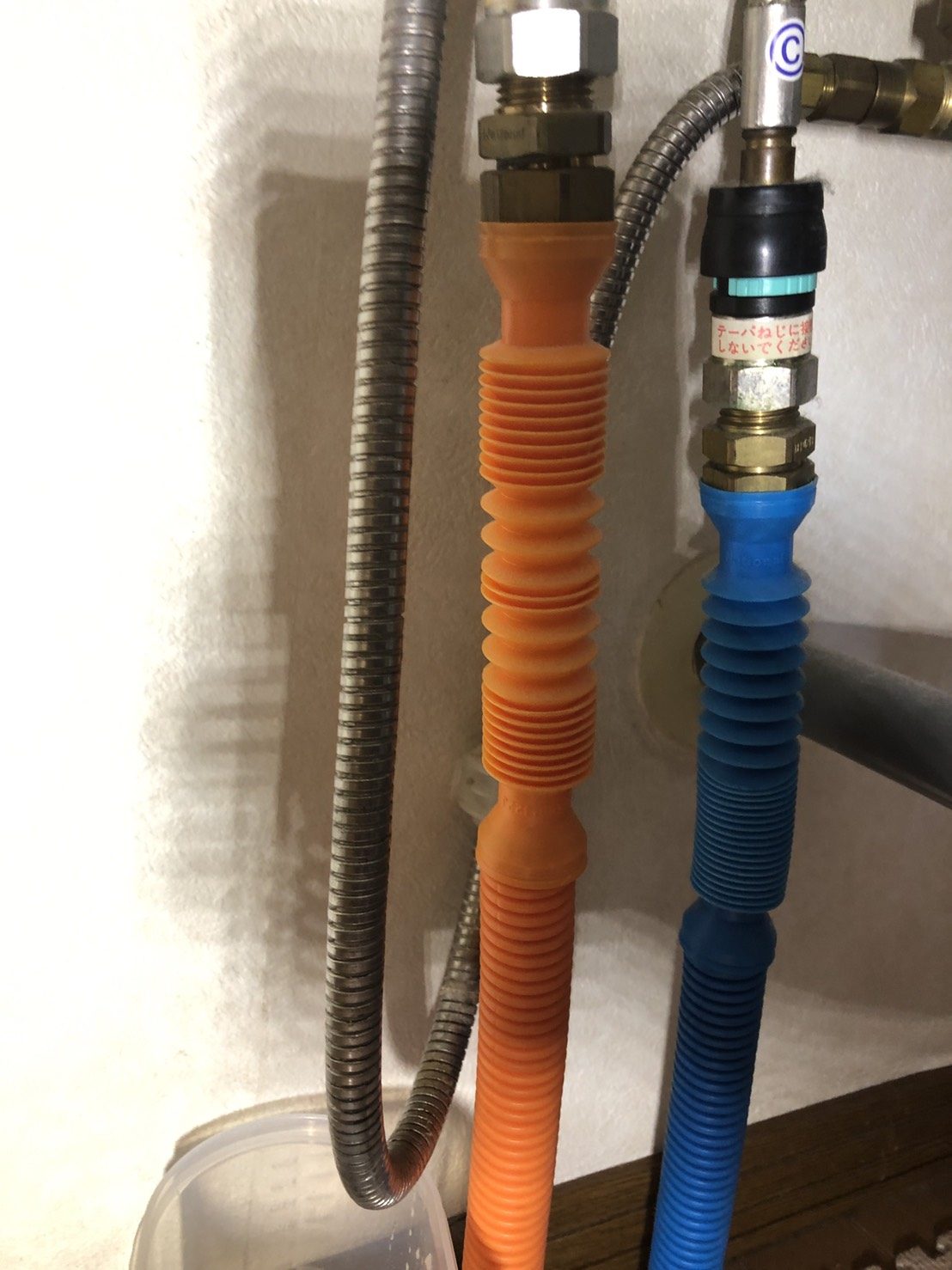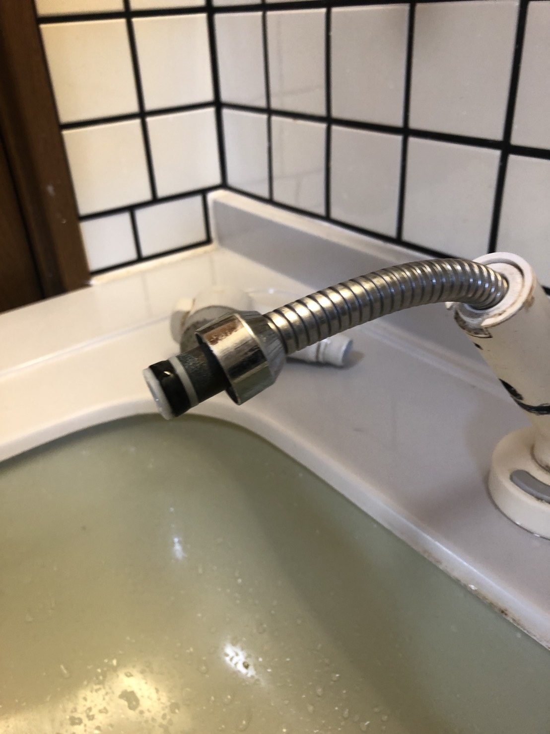 状況を確認した所、洗面化粧台の蛇口を開けるとメタルホース部から水漏れし床に落ちてしまう症状でした。
