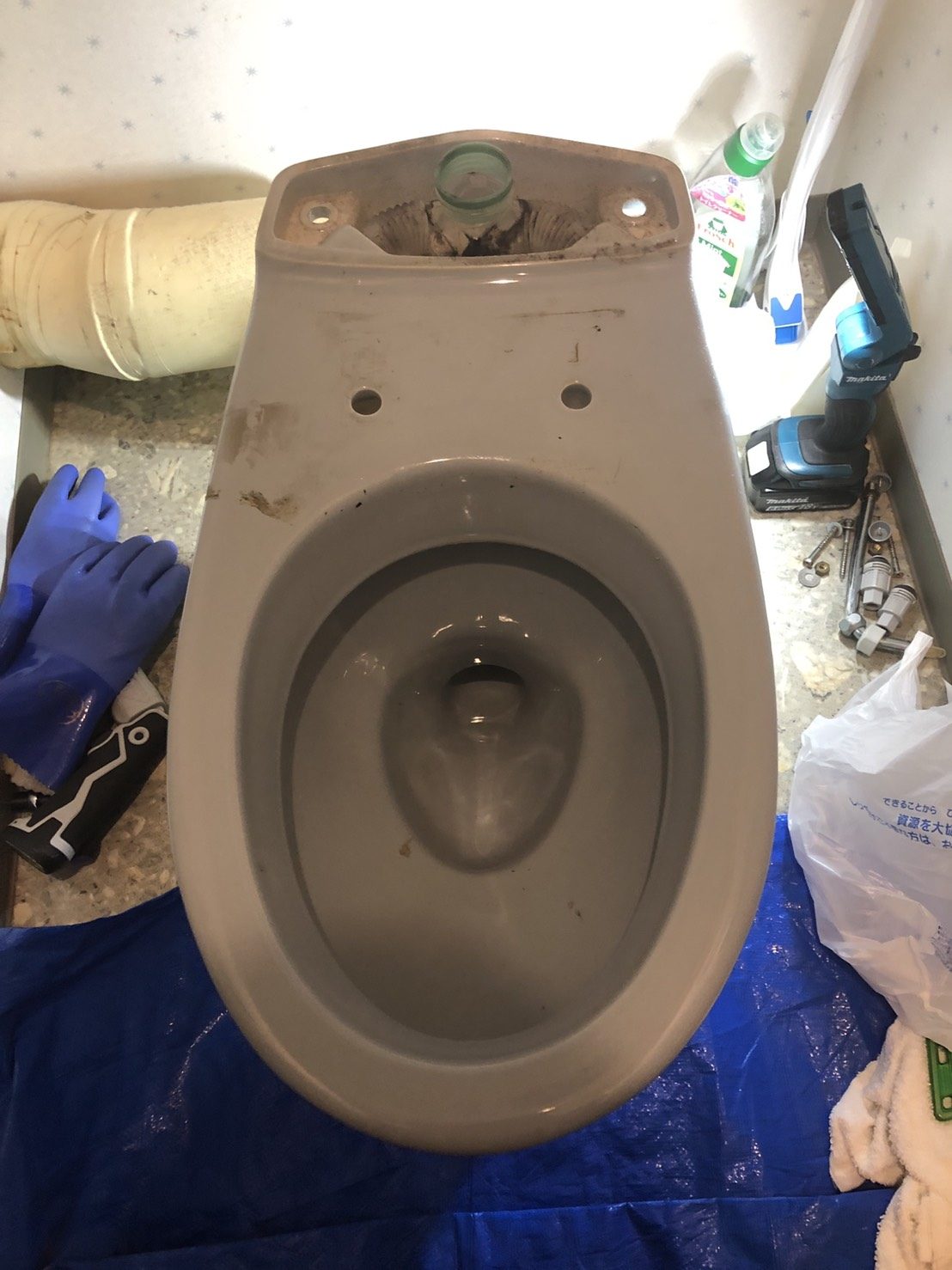 便器の上からつまっている物が確認できませんでしたので、便器を外して異物を取り除く作業のお見積りを事前に行いご納得いただき作業を行いました。