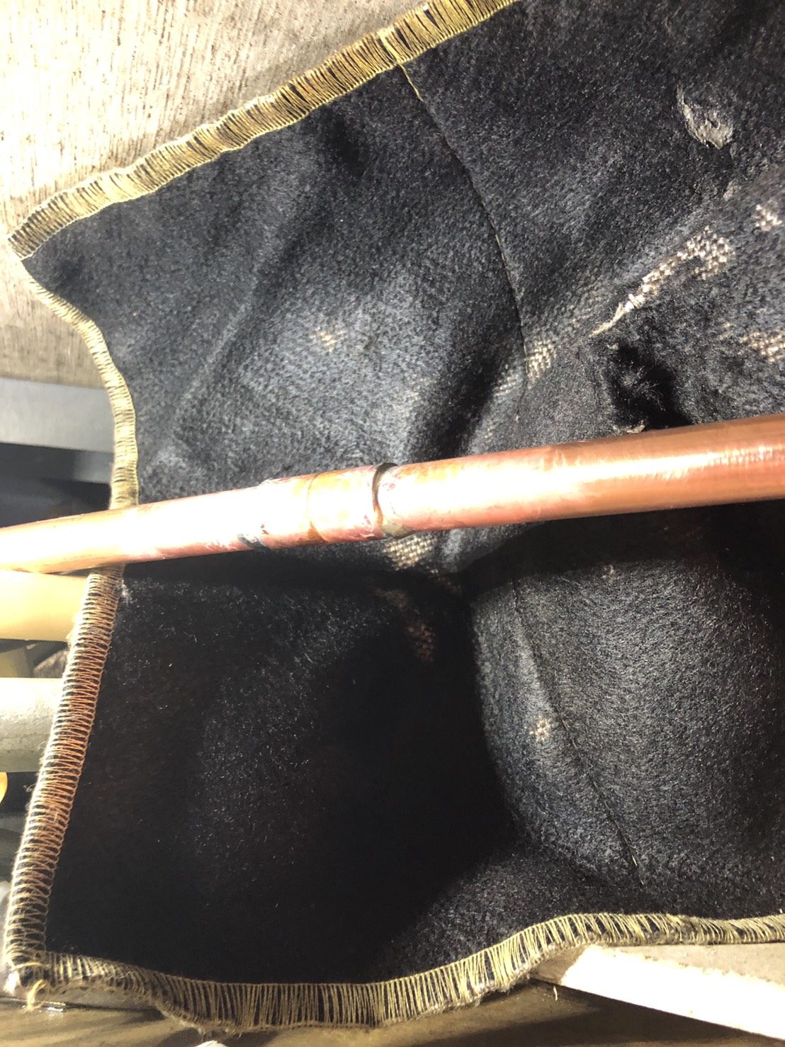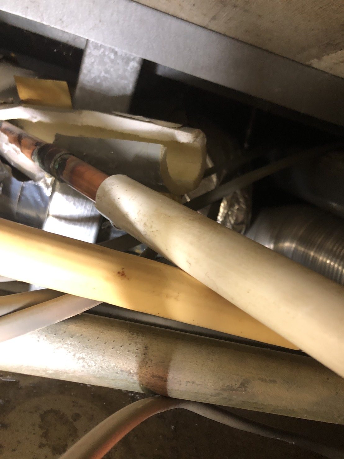 水道管の被覆を剥がした所、給湯管にピンホールを発見しました。ピンホールがある箇所を切断し、新しい銅管で給湯管を作り直し通水テストを行い他の箇所に水漏れがない事を確認し改善しました。
