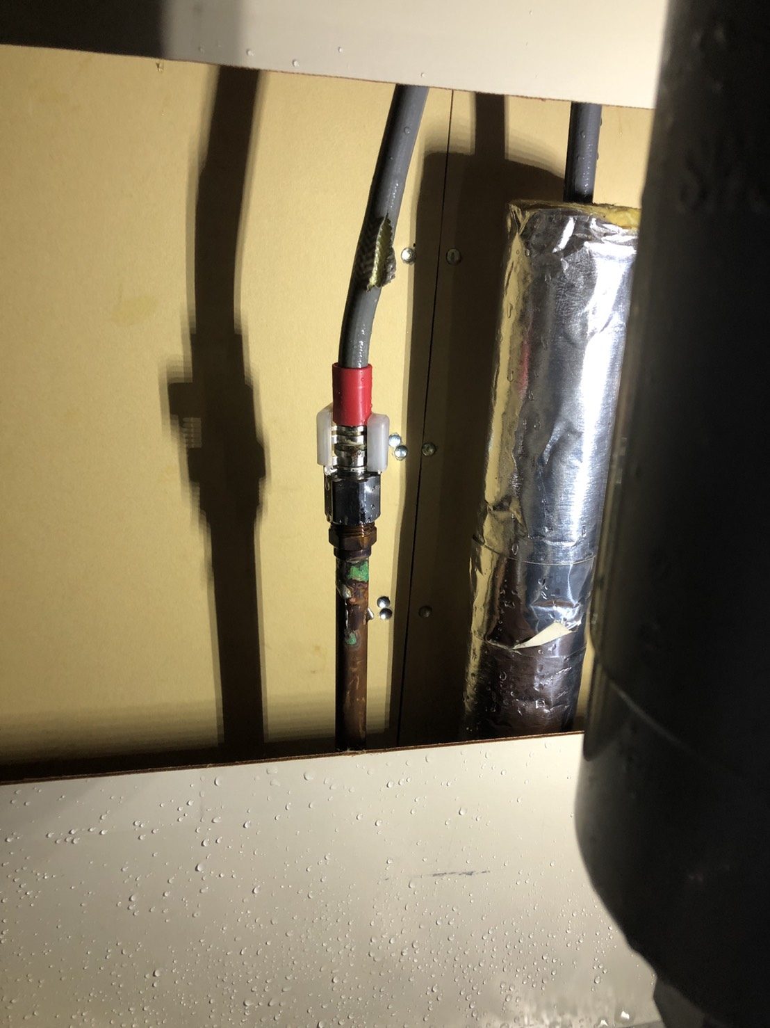 台所の点検口を開けて確認した所、蛇口の給湯側のホースに亀裂が入っているのが確認でき銅管からも水漏れしている状態でした。