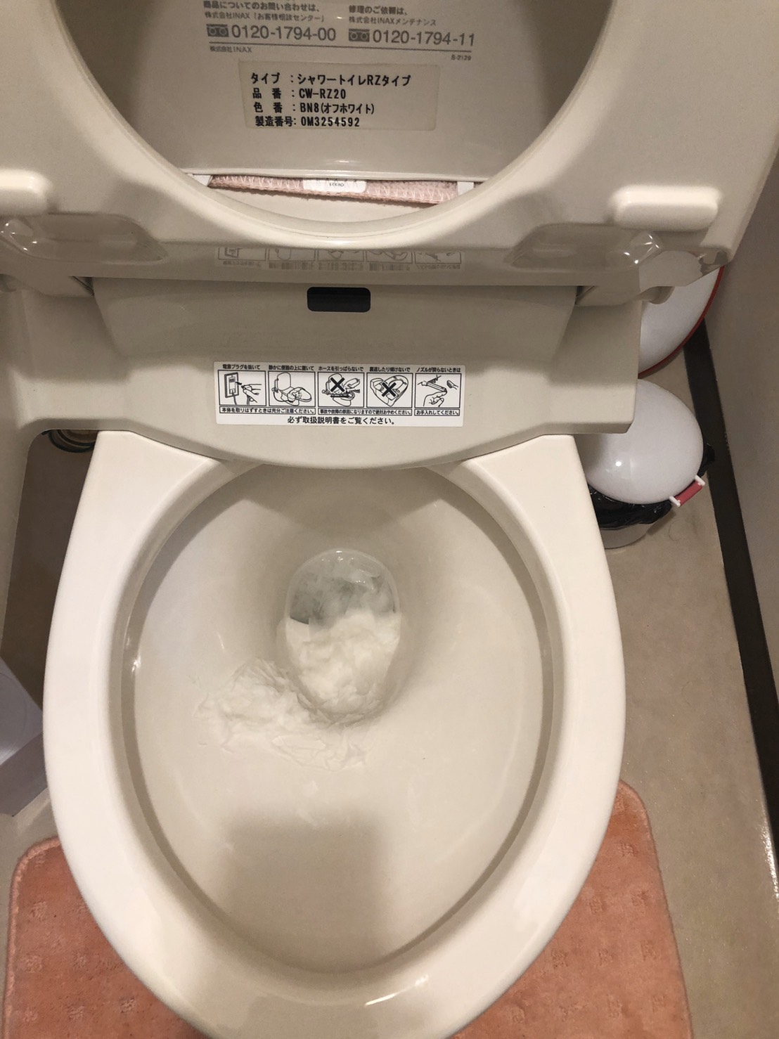 お客様に心当たりをお尋ねした所、お掃除シートを大量に流してしまったとの事で、つまり抜き作業のお見積りを事前にご提示しご納得いただき作業を行いました。