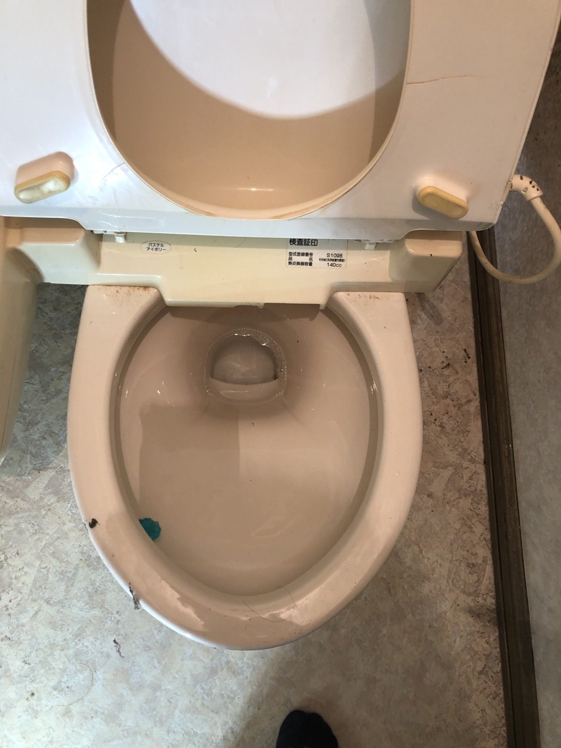 はさまっていた芳香剤などを取り除き、トイレをつけ直し症状が改善しました。